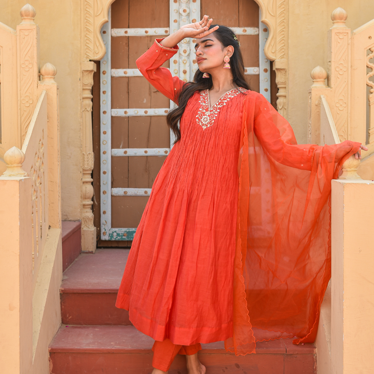 This dusty orange Mal Chanderi set features an A-line kurta with a V-neckline and 3/4 sleeves, adorned with elegant Gotta Patti work.