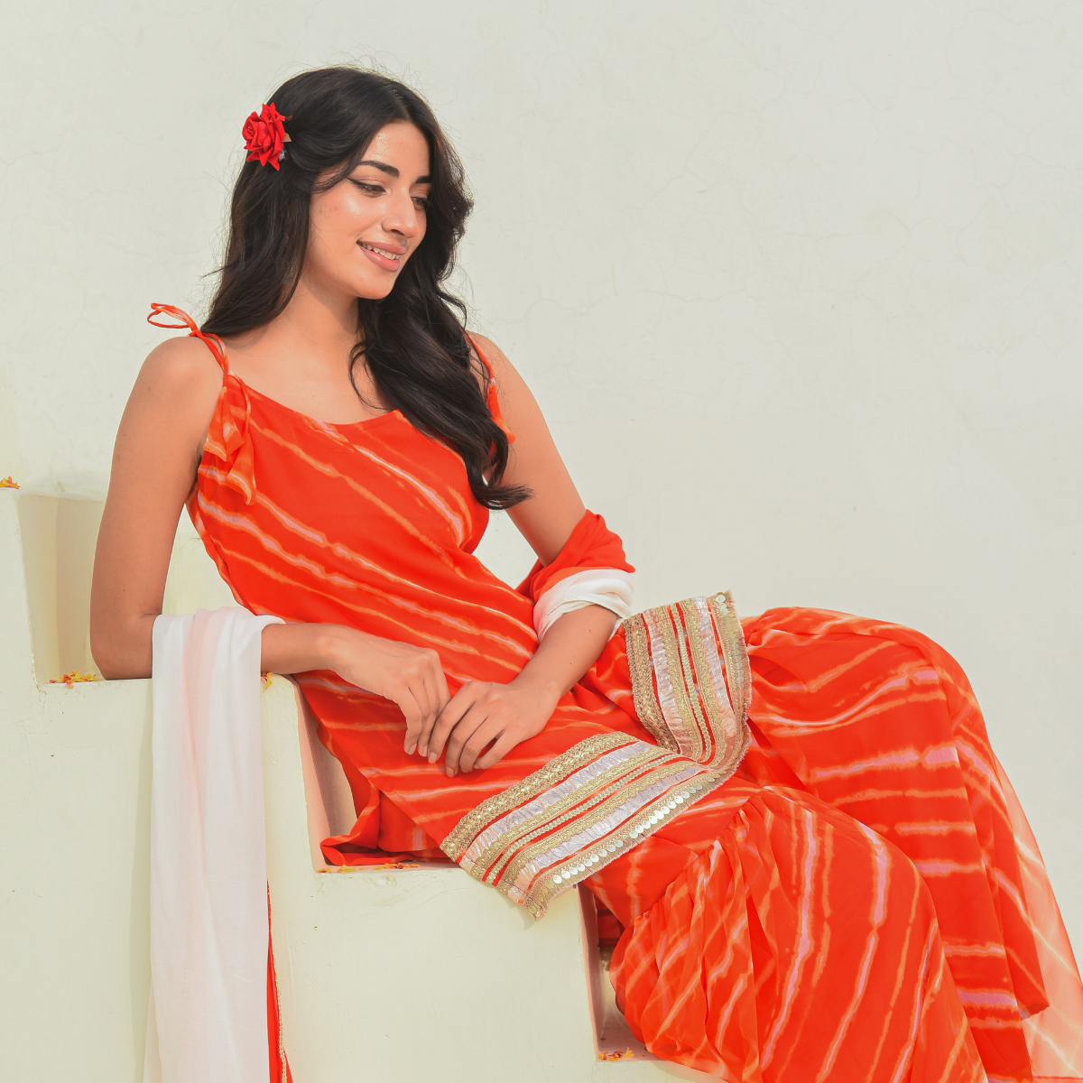 This stylish three-piece set features a sleeveless orange kurta with a scoop neckline, adorned in a vibrant leheriya print.