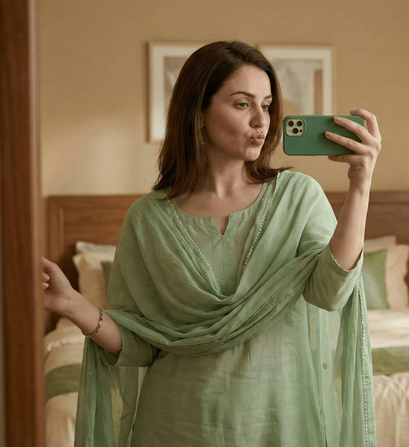 This fern green Mal Chanderi set features an A-line kurta with a slit neckline and full sleeves, adorned with delicate Mukesh work. It includes a comfortable cotton pant with a half-elastic waist and pull-up closure, paired with a graceful organza dupatta—perfect for festive and elegant occasions.