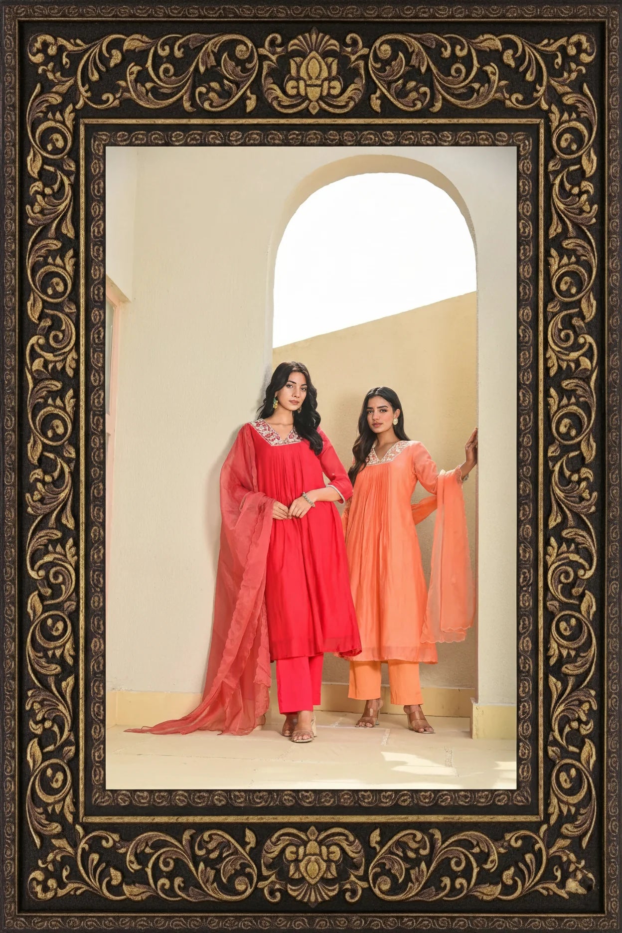 This dusty orange Mal Chanderi set features an A-line kurta with a V-neckline and 3/4 sleeves, adorned with elegant Gotta Patti work.
