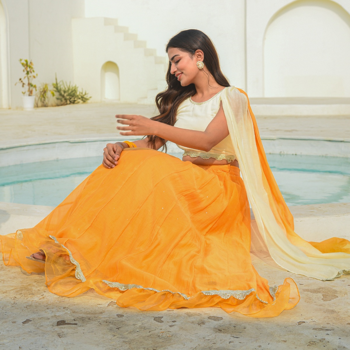 This yellow Mal Chanderi set includes a sleeveless blouse with a scoop neckline and attached shaded dupatta, paired with a flared lehenga with ruffle .