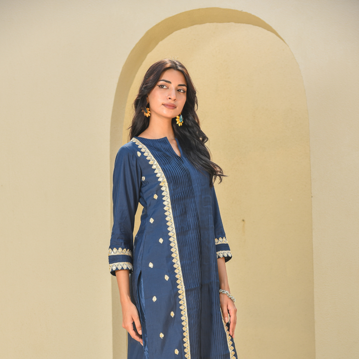 This navy blue set features a kurta with a slit neckline and 3/4 sleeves, crafted from rich Pollyn silk with elegant zari work.