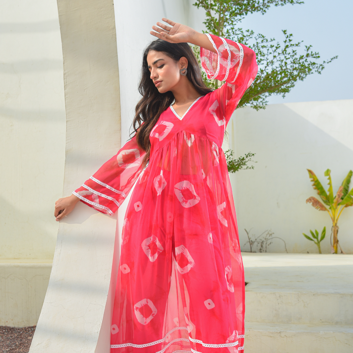 This Ruby pink set features a chiffon kurta with a V-neckline and full sleeves, showcasing a vibrant tie-dye effect.