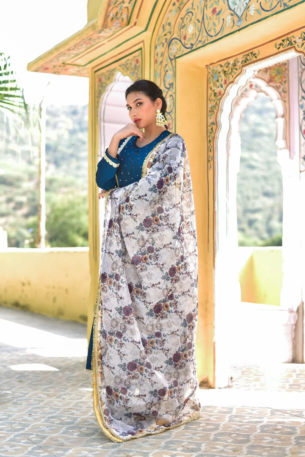 Peacock Blue Kurta & Pant With Floral Dupatta