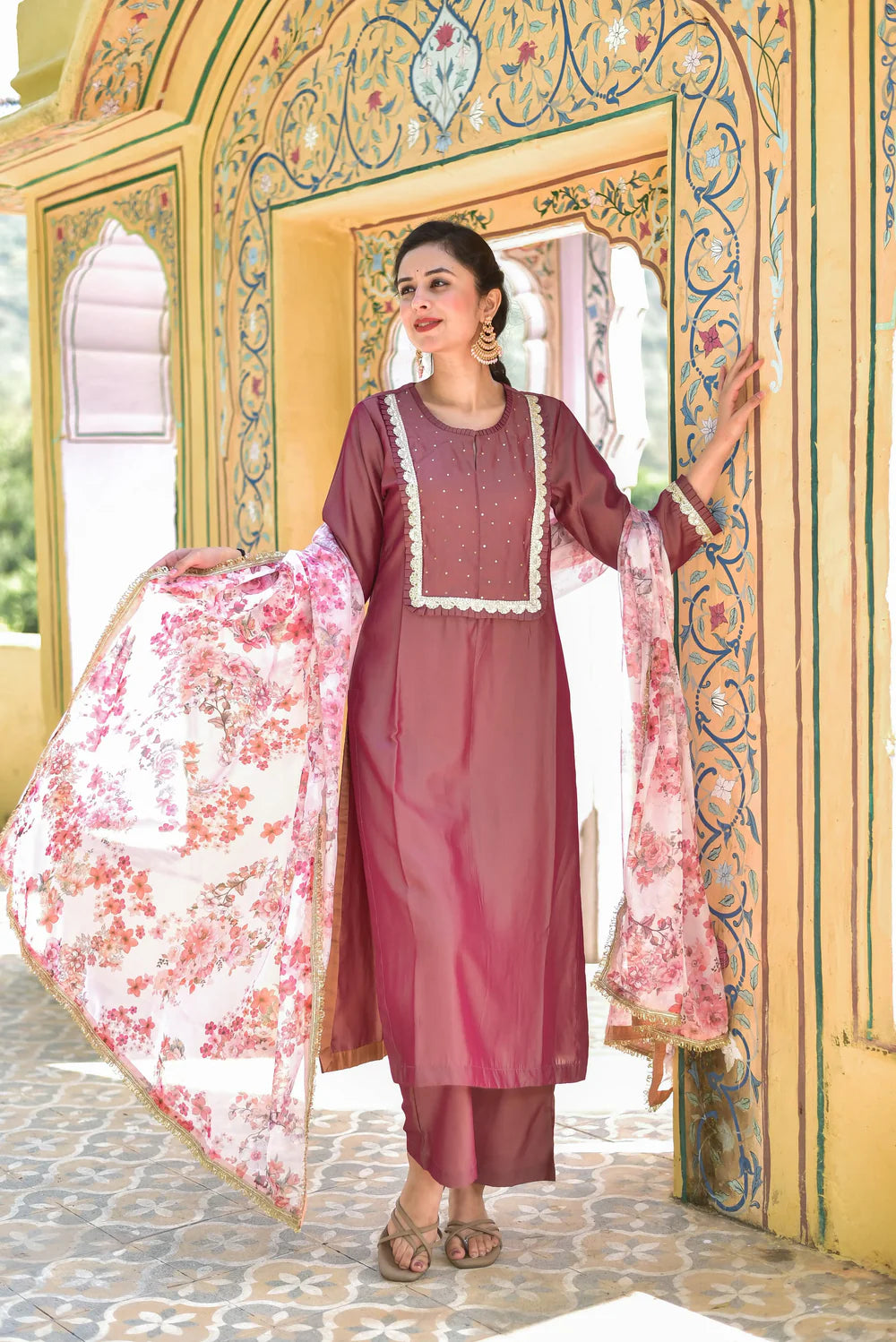 Onion Pink Kurta & Pant With Floral Dupatta