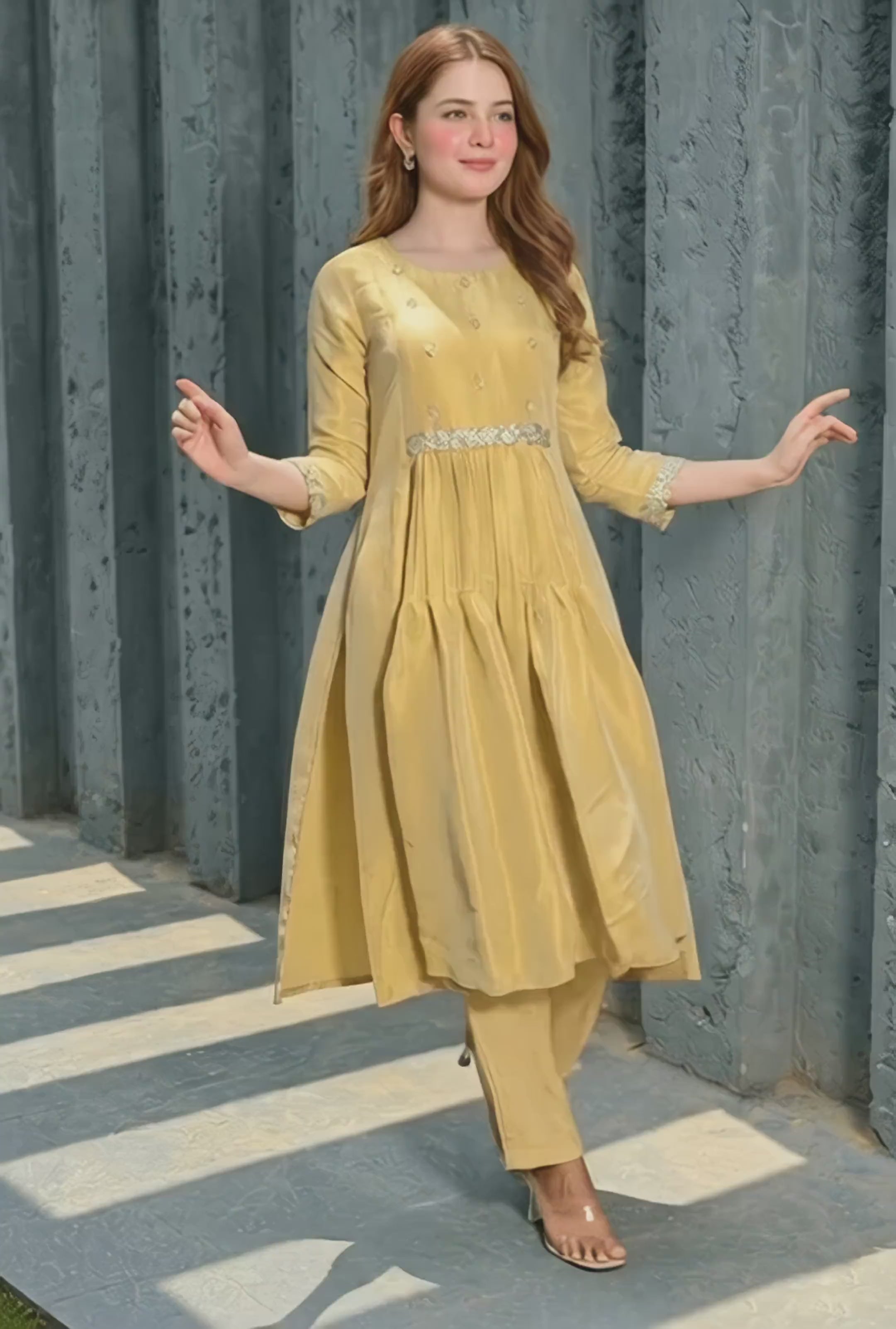 This beige set features a Zari silk A-line kurta with a scoop neckline and 3/4 sleeves, designed with a pull-up closure. It is paired with comfortable half-elastic cotton pants, blending elegance and ease for everyday or festive wear.