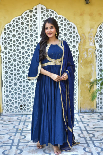 Channel the timeless grace of Mastani in this breathtaking royal blue anarkali set. The dramatic floor-length silhouette flows like poetry in motion, while the rich sapphire hue commands attention at every celebration. This is not just an outfit—it's a statement of majestic elegance.