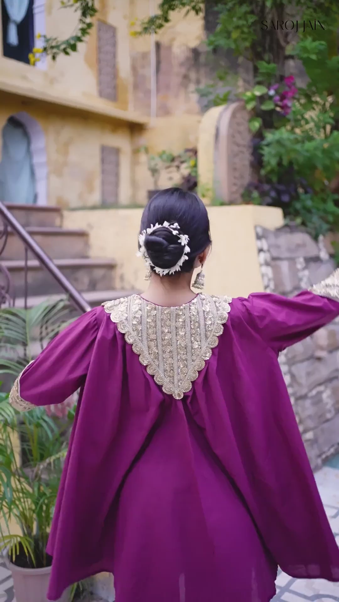The rich mulberry hue exudes regal sophistication, while intricate gold lace work adorns the neckline and sleeves, creating a mesmerizing contrast that catches the light with every movement. Each delicate motif is a testament to artisanal excellence, elevating this co-ord from everyday wear to occasion-ready elegance.