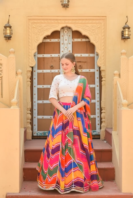 This vibrant multi-colour set features a muslin blouse with a sweetheart neckline, half sleeves, and a side zip closure. It is paired with a flared chiffon lehenga with a hook placket and string closure, and a matching chiffon dupatta. Adorned with traditional leheriya patterns, this ensemble is perfect for festive and celebratory occasions.