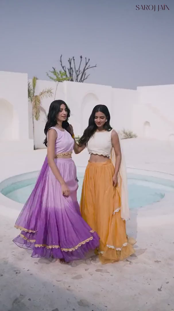 This yellow Mal Chanderi set includes a sleeveless blouse with a scoop neckline and attached shaded dupatta, paired with a flared lehenga with ruffle . Featuring Mukesh work and lace detailing, the blouse has a side zip closure, and the lehenga comes with a hook placket and zip—perfect for festive elegance.
